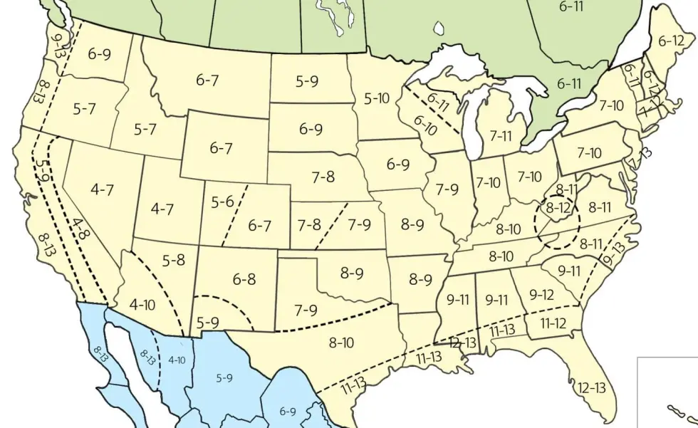 The map illustrates the average moisture content for interior wood products across the United States. Keep in mind that actual micro-climate conditions can differ within the same region, and seasonal humidity changes may cause natural fluctuations in wood moisture levels.