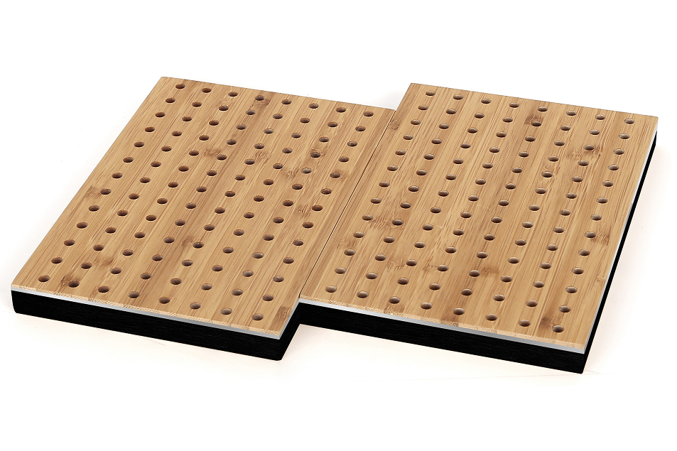 Designed specifically for standard ceiling grid systems, the CoreBOO DROP-IN Perforated Panels offer the same acoustic and aesthetic benefits as our Perforated FELT Panels, but in a format tailored for easy installation. Available in three standard perforation sizes and patterns, these panels feature a sandwich construction: the CoreBOO veneer is laminated onto a thin, recycled aluminum substrate (providing rigidity, stability, and fire resistance), which is then bonded to a 24mm recycled PET felt backing for added acoustic performance.