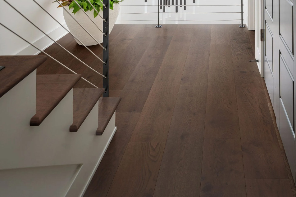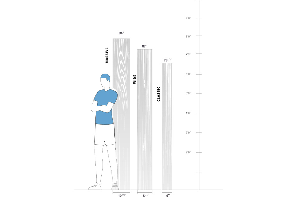 Hightech WOODS: Wide plank without issues. Large format (wide plank and long lengths) wood flooring planks constructed using real wood sawn veneers (single strip) laminated onto a proprietary by-product component ‘Hightech’ core. Available in 3 different widths (Classic, Wide, and Massive), each with a different, fixed corresponding length,