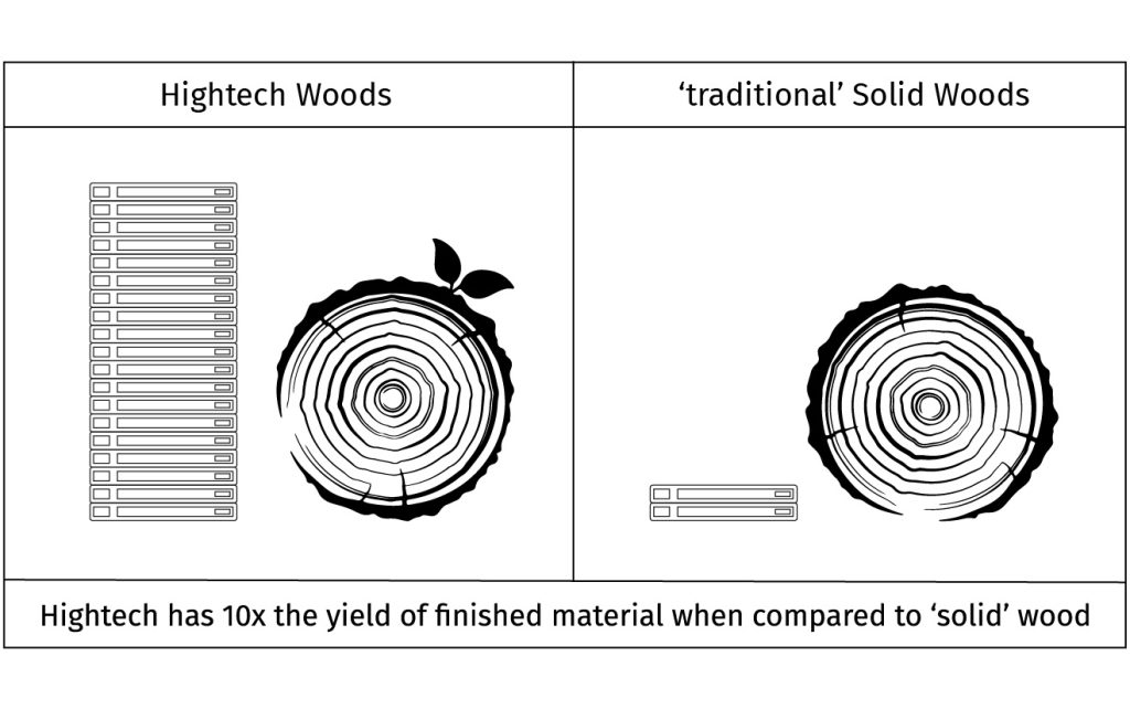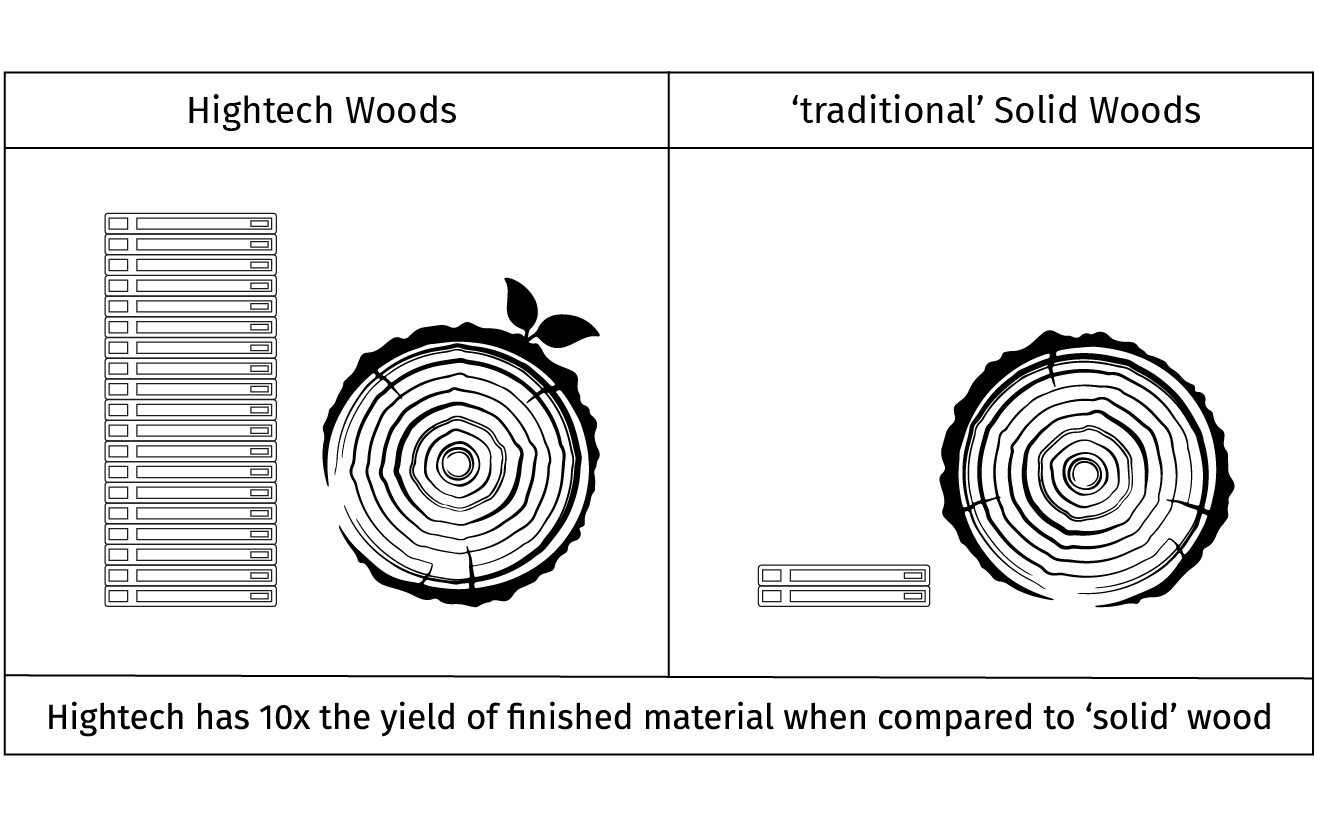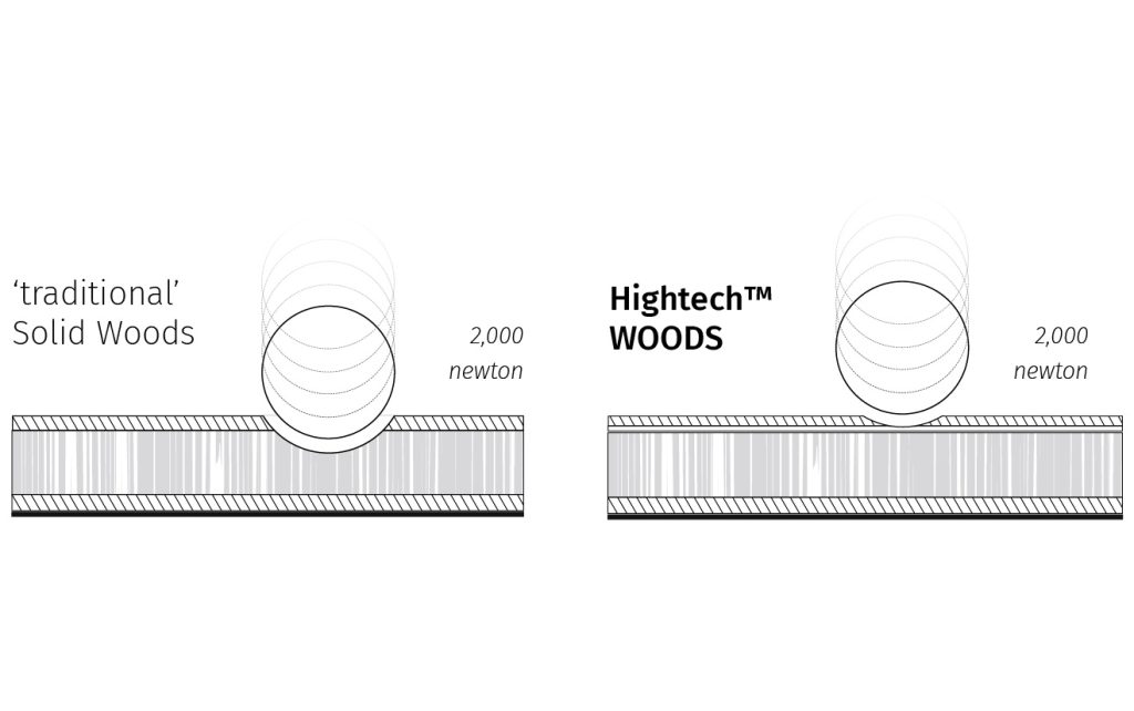Hightech WOODS: Wide plank without issues. Large format (wide plank and long lengths) wood flooring planks constructed using real wood sawn veneers (single strip) laminated onto a proprietary by-product component ‘Hightech’ core. Available in 3 different widths (Classic, Wide, and Massive), each with a different, fixed corresponding length,